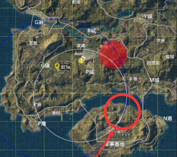 跑毒的时候,很多玩家喜欢直接沿着白线指示直插安全区中心,这个时候,你就暴露在四周的伏地魔眼中了。最佳办法是沿着蓝线绕到红圈标出的地方.跟多时候,在行走的过程中,会看到不少伏地魔,不过很多伏地魔都来不及反应,此时的你只要枪法过关,拥有很大优势。