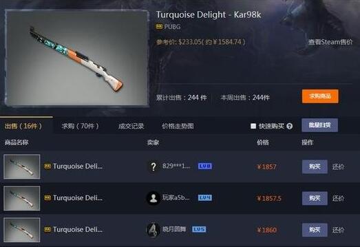第三方平台上在售最贵的为碎魂98K,参考价格为1584rmb。但卖方的基本定价都在1800-1900rmb左右(堪比两把火麒麟)。紧随其后的是碎魂系列的M16A4皮肤。售价约在1300-1400rmb左右。这两款皮肤的开箱几率在0.012%,极低的开箱几率导致极其稀少,故而售价也是非常之高。也是非常之高。