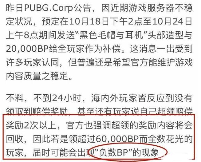 蓝洞因为更新延迟才补的20000BP,虽然有玩家卡出了两倍甚至三倍的BP,但是蓝洞官方也随后发表声明称多发放的BP会回收,只是回收的时间拖到了11.2号。如果在此期间玩家没有一次性消耗完那么多BP,那么也不会背上几万BP的“盒贷”。说到底还是玩家们的贪心,要知道出来混迟早是要换的。