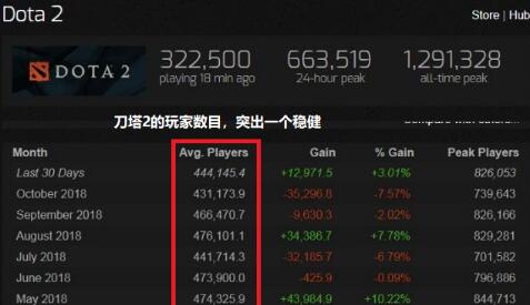 《DOTA2》近一个月的平均在线玩家人数约为44.4万;而《绝地求生》在经历过2018年1月历史最高的323.6万人同时在线神话后,玩家在线人数开始持续下滑。