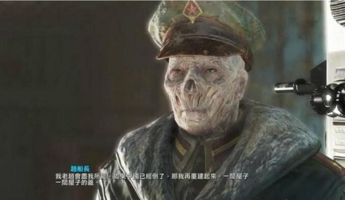 《辐射4》中有一名中国军人,“扬子”号(又译长江号、扬子江号)核潜艇上的赵船长,他于2077年10月23日奉命对联邦发射了扬子号上全部的微型核弹,受到辐射影响,赵船长已经变成了尸鬼,而他的船员都变成了狂尸鬼被他锁在下层船舱里,同时扬子号也失去了动力,赵船长独自一人在扬子号里活了200多年。当玩家找到他后,他会给玩家一个修理船只的任务,当你帮助他修好了引擎之后,他会告诉你,他其实一心只想回到自己的祖国,所以一直在这里等待,等待有一天可以修好船只实现自己的愿望,即使是中国已经被毁,也要自己努力将其重建。这位军人的精神着实感动了小编,他是一个非常纯粹的爱国者,一名伟大的军人,在当今社会里,像这样抱有纯粹信念的人已经不多了。所以小编认为,他就是完美的NPC~好了,“高大全”讲完了,然后讲点实在的。