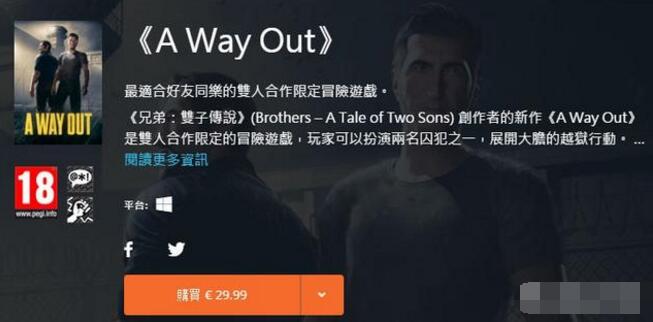 《逃出生天》又叫《A Way Out》是EA发行的一款冒险游戏,这款游戏跳脱以往的游戏框架,这款游戏主要是玩家扮演两个角色之一,然后在游戏内展开惊险刺激的越狱行动,两名主角为了逃出生天而携手合作。这款游戏在橘子(Origin)平台上有出售,这是一款冒险游戏,其价格只需要29.99元,要购买这款游戏就去下载一个橘子平台吧。