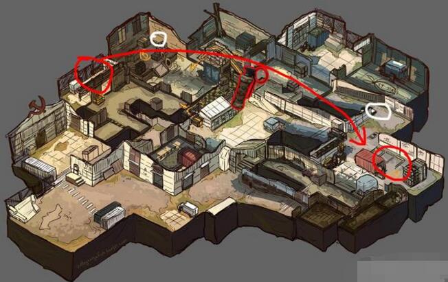 (红色为T方投掷诱饵雷距离,白色为CT站位)