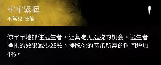 此技能满级效果:逃生者挣扎效果减少75%,逃脱时间增加12% 。很多会玩的幸存者会蹲下卡视角挡在路上或是钩子附近,让你无法将抓到的幸存者挂上钩子,给队友争取挣脱的时间,牢牢紧握在这个时候就会很好用啦。
